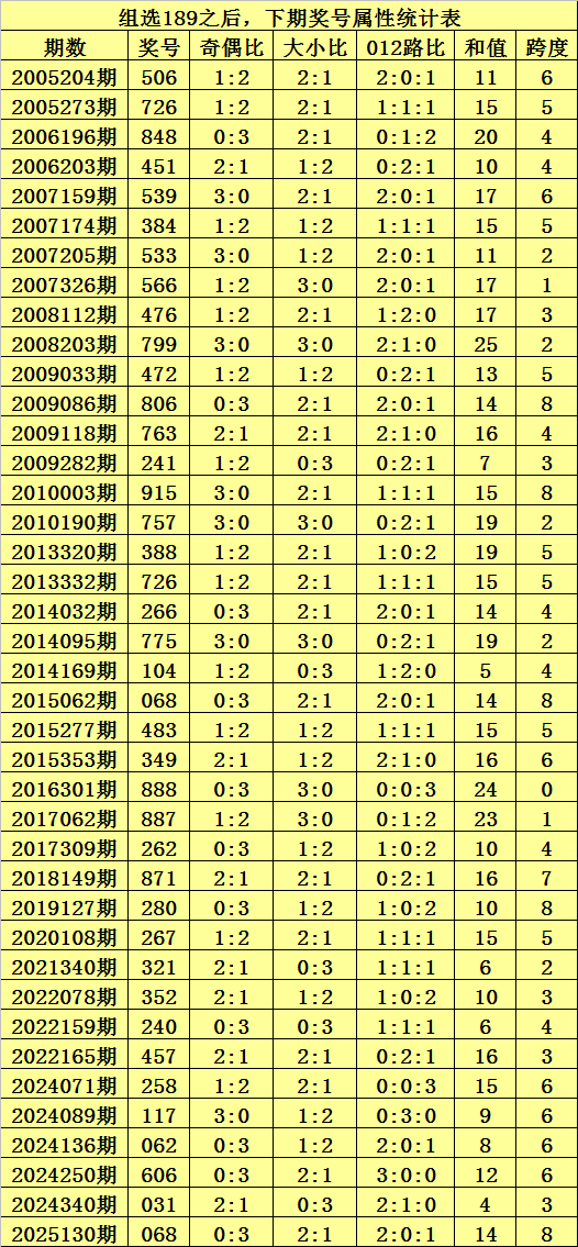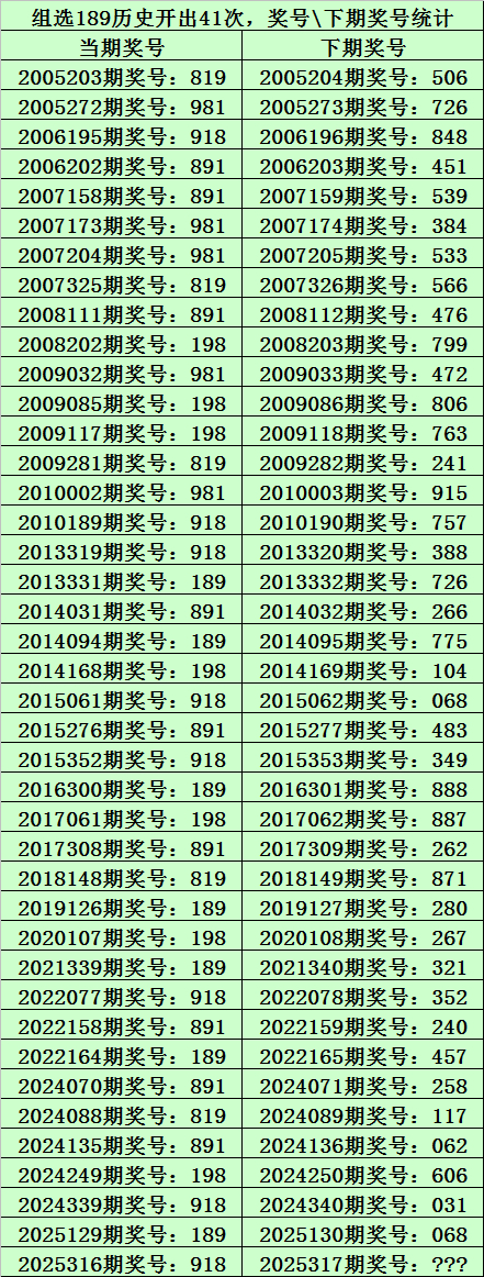 上期回顾:排列三第2025316期奖号为:918,类型:组六,历史上直选号码918出现了8次,组选号码189出现了41次。