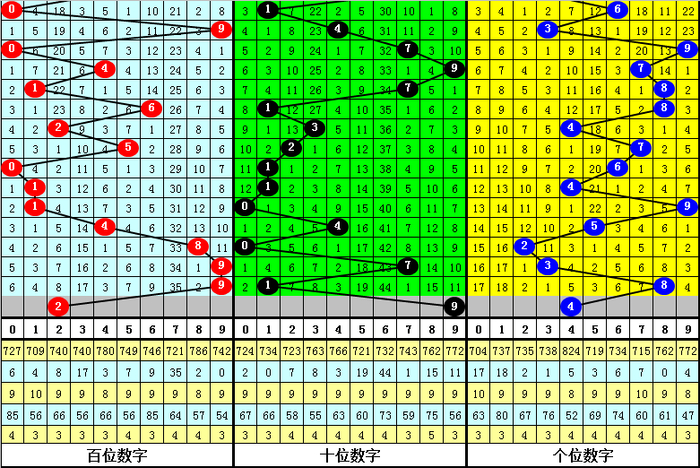 3、在以上0-9号码频次中,号码奇偶比为39:37,大小比为35:41,本期预计百位开出小 号,参考号码2。