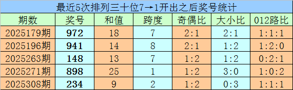 1、最近两期排列三十位号码开出号码分别为7和1,历史上十位号码连续两期同时出现号码7和1的奖号共开出80期。最近五次下期开出号码为:972、941、148、898、234;