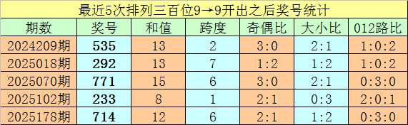 1、排列三最近两期百位号码分别开出9和9,历史上百位号码连续两期分别开出9和9的奖号出现了77期。前五期开出之后其下期奖号分别为:535、292、771、233、714;