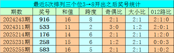 1、排列三前两期个位分别开出号码3和8,历史上个位号码连续两期分别出现3和8时,共有74次。在最近5次出现时,其下期分别出现号码:916、533、176、258、583;