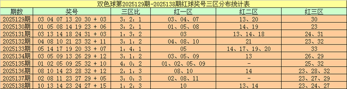 双色球第2025138期奖号为:10 13 14 23 24 27 + 15,红球三区比为1:2:3。